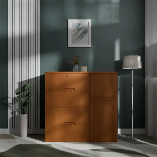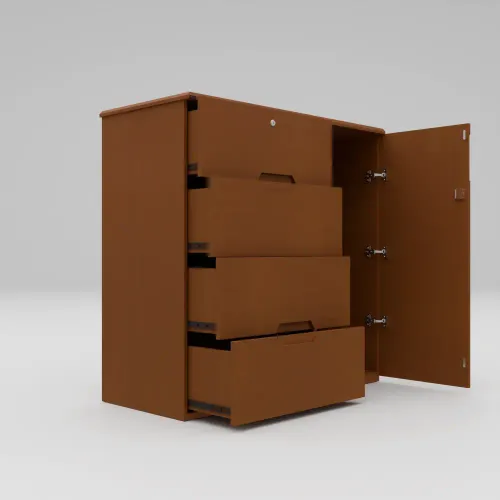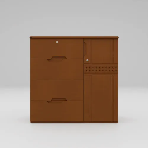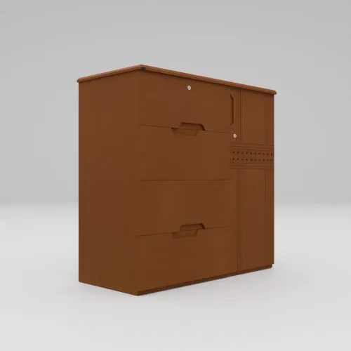 The wooden chest of drawers is meticulously crafted from high-quality imported beech wood, showcasing exquisite woodworking skills. With smooth lines, tasteful ornamentation, and well-finished surfaces, it complements various interior styles, from classic to modern. There are 4 drawers & 1 side shutter with an attractive design, a 32mm thickness top, and a wooden handle, which features an elegant and timeless design, blending both traditional and contemporary elements. High-quality, environment-friendly Lacquer in Light color (outside & inside) finish. It has imported high-quality rust-free hardware fittings.