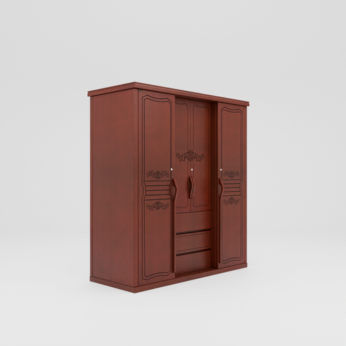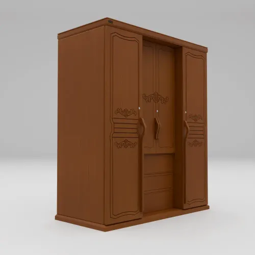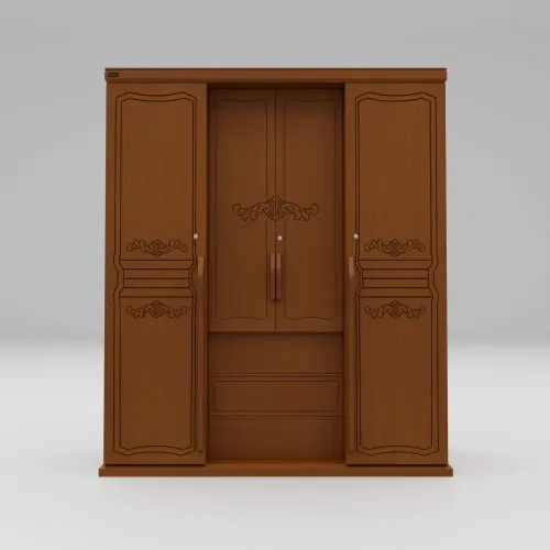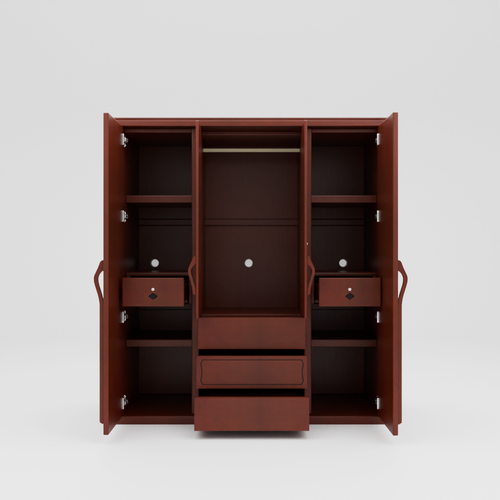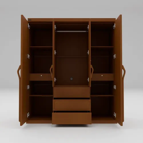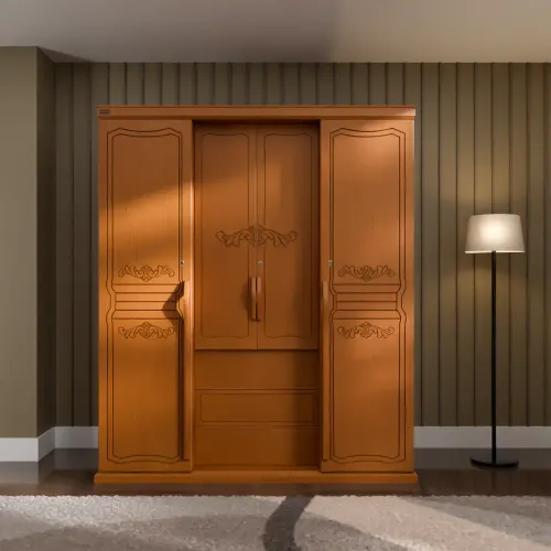 A wooden almirah is a storage unit made primarily of wood. It is typically constructed using high-quality vineer process wood & imported beech wood, such as plywood or medium-density fiberboard (MDF). The grain patterns, textures, and finishes of wooden almirahs contribute to their aesthetic appeal, creating a timeless and classic look. Its anatomy description is 4 Shutter with an attractive wooden handle design, slat, inside small 2 drawer, shelf & hanger. High-quality environment-friendly Lacquer in Light color (outside & inside) finish. Imported high-quality rust-free hardware fittings. Most of our furniture is made of natural components, which will have natural differences in grain construction and occasional minor blemishes.