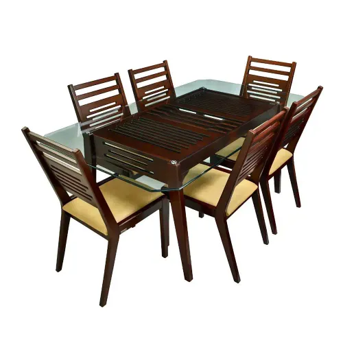 Introducing a stylish and comfortable modern dining table for home decoration. This design is a graphical design to use as a part of modern home decoration. This dining table has been ergonomically designed to provide optimal comfort and support. The dining table is constructed using high-quality processed wood that has been carefully selected for its durability and beauty. It has used an environmentally-friendly PU lacquer finish in a light color. This dining table is a perfect choice for a dining room to use for a comfortable meal. To protect water, it uses a high-quality tempered 10 mm glass in the top with high-quality imported hardware.