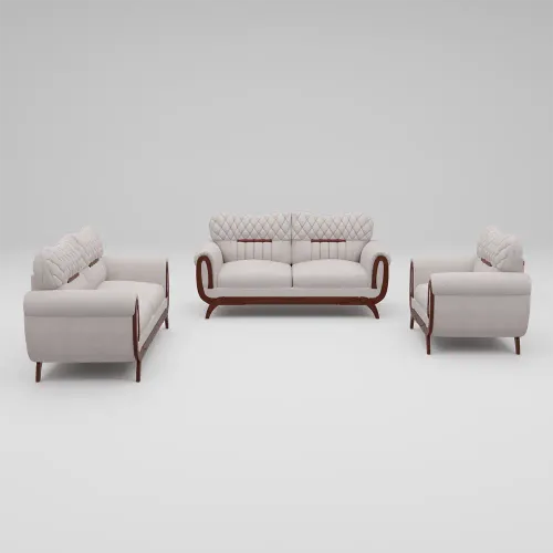 This Sofa is made from imported Oak/Beechwood and veneered with processed wood, including an innovative CNC cutting design. Here the best quality environment-friendly PU lacquer polish as Light, Antique & Natural is available for customers. High-quality rubber foam and Quality Fabrics upholstery as well.