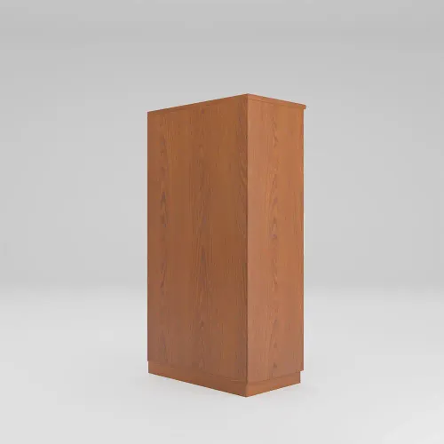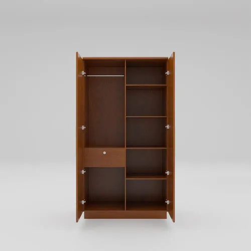 This almirah is made from a Laminated Melamine Board. The grain patterns, textures, and finishes of wooden almirahs contribute to their aesthetic appeal, creating a timeless and classic look. Its anatomy description is 2 shutters with attractive design slats, inside a small 1 drawer with lock, 4 shelves, and a big hanger zone. Imported high-quality rust-free hardware fittings. Most of our furniture is made of natural components, with natural differences in grain construction and occasional minor blemishes.