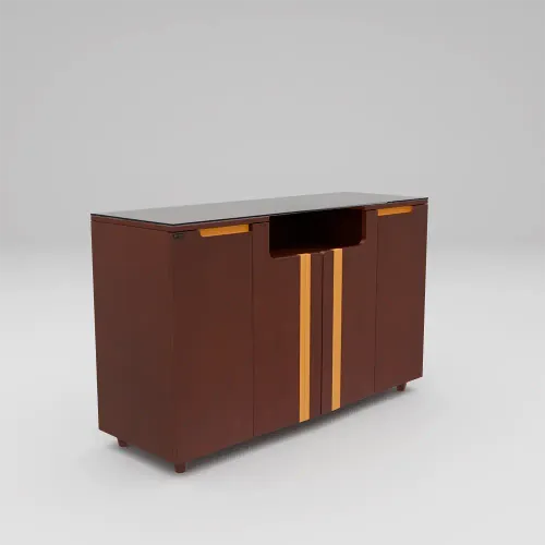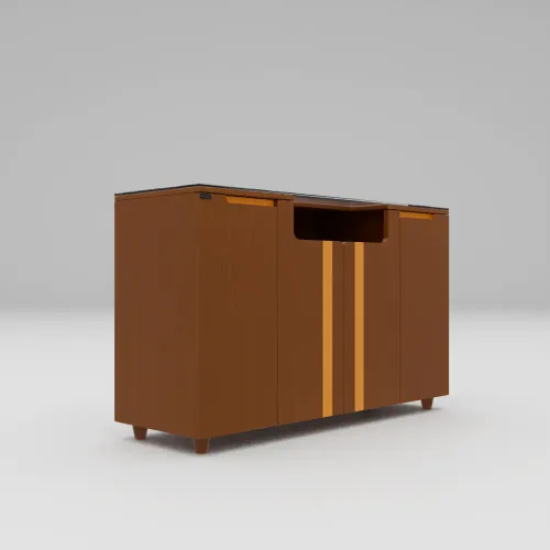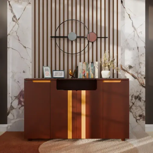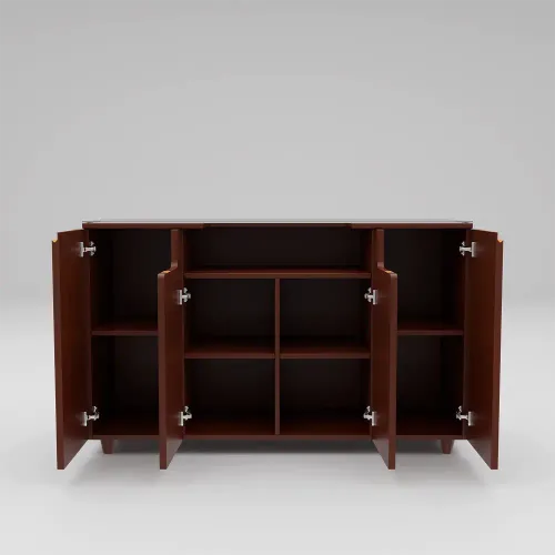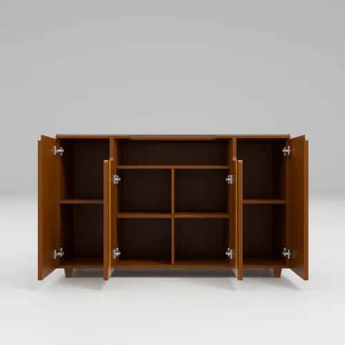 A sideboard offers valuable storage and organization space for a variety of items. This sideboard was crafted with precision using high-quality Veneer wood. This sideboard boasts a sleek design that effortlessly complements any space. With 8 spacious shelves & three partitions, it provides sufficient room to organize and display your collections. The Smart legs ensure stability and durability, while the handle design on the front doors adds a touch of sophistication. High-quality, environment-friendly Lacquer in Light color (outside & inside) finish—imported high-quality rust-free hardware fittings.