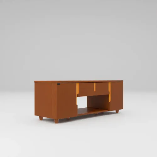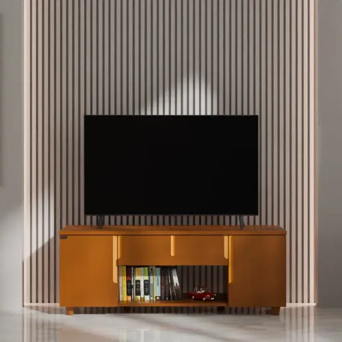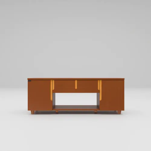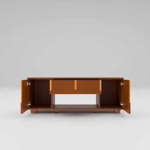 This TV trolley offers valuable storage and organization space for various items. Crafted with precision using high-quality Veneer Process wood. This TV trolley boasts a sleek design that effortlessly complements any space. With spacious shelves & two partitions, it provides sufficient room to organize and display your collections neatly. The Smart legs ensure stability and durability, while the handle design on the front doors adds a touch of sophistication. High-quality, environment-friendly Lacquer in Light color (outside & inside) finish. Imported high-quality rust-free hardware fittings. Enhance your space with the modern charm of the TV trolley.