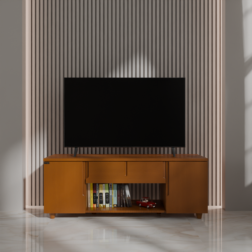This TV trolley offers valuable storage and organization space for various items. Crafted with precision using high-quality Veneer Process wood. This TV trolley boasts a sleek design that effortlessly complements any space. With spacious shelves & two partitions, it provides sufficient room to organize and display your collections neatly. The Smart legs ensure stability and durability, while the handle design on the front doors adds a touch of sophistication. High-quality, environment-friendly Lacquer in Light color (outside & inside) finish. Imported high-quality rust-free hardware fittings. Enhance your space with the modern charm of the TV trolley.